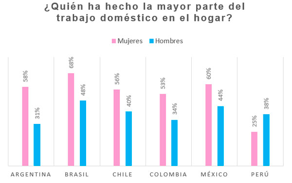 Esto puede explicarse a partir de que las mujeres que participaron en esta encuesta fueron cuestionadas sobre las funciones cotidianas que están restando valor al avance en sus carreras y 53% de las latinas dijo que habían hecho la mayor parte del trabajo doméstico en el hogar, en comparación con el 39% de los hombres.
