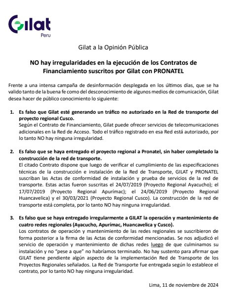 (americasistemas.com.pe. Lima, Perú – 13 de noviembre 2024) En medio de acusaciones sobre presuntas irregularidades en la ejecución de proyectos regionales de telecomunicaciones en el Perú, Gilat emitió un comunicado para aclarar su posición y defender la gestión de la red de acceso y de transporte de estos proyectos. El conflicto, que involucra a los proyectos de Cusco, Ayacucho, Apurímac y Huancavelica, ha generado una creciente preocupación sobre la transparencia en los proyectos de conectividad rural, fundamentales para cerrar la brecha digital en el país.