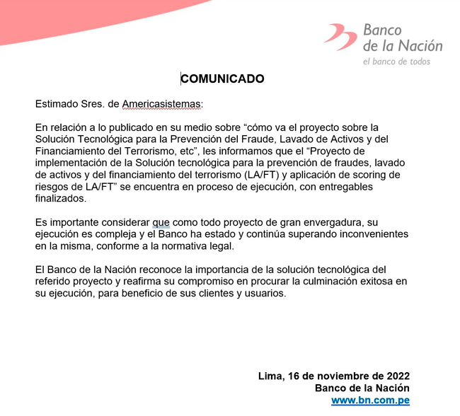 “Toda organización que se precie de responsable, debería contar con una herramienta para prevenir el Lavado de Activos y otras variables que hacen daño al mercado” nos dice un especialista de la industria nacional. El Banco de la Nación nos envió un comunicado respecto a la nota emitida en la edición anterior (aquí) pero que despierta mayores interrogantes. La misiva señala que hay entregables finalizados, pero no dice si la puesta en marcha es en el presente año, el próximo o el subsiguiente. Tampoco señala el motivo de demora del consorcio Mainsoft/Smartsoft, ganador del proyecto, lo único que advierten que se trata de un proceso complejo. Publicamos el comunicado emitido por la gerencia general, a cargo de Isaías Villanueva Mory, uno de los artífices del proyecto.