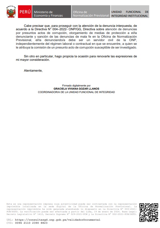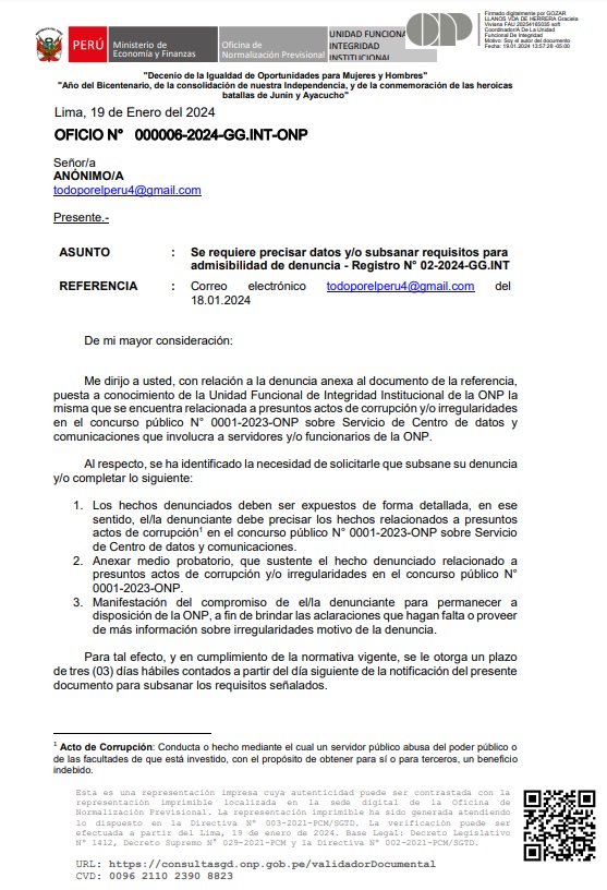 (americasistemas.com.pe. Lima, Perú – 07 de febrero 2024) Esta grave omisión no ha sido tomada en cuenta por la Contraloría, lo que genera perplejidad y la sensación de que la corrupción se está arraigando en el Perú. La carta de respuesta de la funcionaria Gozar Llanos se presenta a continuación, generando incredulidad entre los lectores.